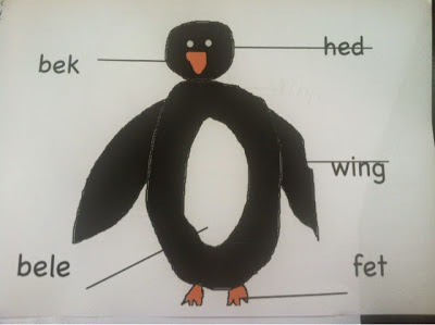As part of our ongoing penguin unit, the class will read over the chart of information (a T-Chart with the headings, Penguins have, Penguins are, Penguins can…) that students have been building using facts collected throughout the unit. Ask for volunteers to read a fact off of the chart using the class favorite "penguin pointer" or share an interesting fact that they remember. As facts are shared, focus the discussion on parts of a penguin.